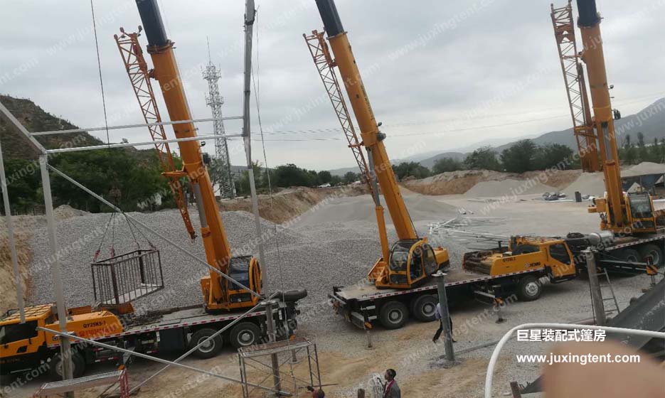 后來老板介紹道:“這是江蘇一家工廠研發(fā)出一種裝配式的廠房,跨度可達80米、長度無限延伸、高度10多米,能抗風載雪,材料也是高度符合環(huán)保要求。 如果不蓋棚子,這個灰到處飄,二十米內全都是灰,路上草上樹上地上,到處都是。長年累月積累下來的灰,相當驚人的。這樣做就把大部分灰留在了廠區(qū),不至于飄灑的哪里都是。像我做這個石料行業(yè)的,開采地點會時常變更,堆積物料的卸貨點也會變更,這就要一個遮蔽物隨著工作地點的變化而變化。而我現(xiàn)在使用的這種裝配式篷房就能輕松實現(xiàn),裝配式篷房就可以隨意搭拆,如果框架加上輪轂就可以實現(xiàn)篷房哪里需要哪里“走”。而且咱們也要積極樹立綠色治理理念,轉變思維,創(chuàng)新發(fā)展,為進一步提升全市的生態(tài)環(huán)境治理和空氣質量提升做出更大貢獻。”看來這位老板不僅會做生意,也非常有“覺悟”的!