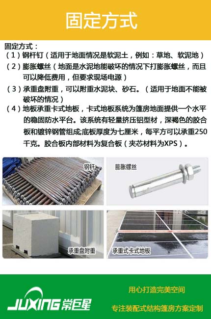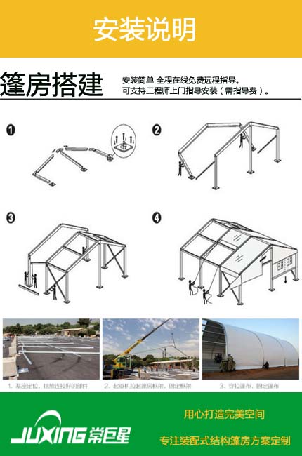 常州巨星裝配式篷房公司是一家篷房研發(fā)、生產(chǎn)、銷售、租賃于一體的綜合性篷房公司。巨星公司秉著誠信經(jīng)營、客戶至上的經(jīng)驗(yàn)理念服務(wù)客戶。常巨星篷房適用于:室外臨時(shí)展廳,餐飲區(qū)、產(chǎn)品促銷、主題研討會(huì)、奠基儀式、戶外活動(dòng)、公司慶典、短期倉庫、婚禮等。“銳意進(jìn)取”的意識(shí)是巨星追趕時(shí)尚潮流的保障。美侖美奐的品質(zhì)、優(yōu)良周到的服務(wù)是我們至誠的追求和不變的信念?,F(xiàn)有篷房主體框架為中空鋁合金結(jié)構(gòu),連接部位為采用國家焊接鋼結(jié)構(gòu),可調(diào)節(jié)式基座可彌補(bǔ)場(chǎng)地的不平,篷房采用PVC篷布,該篷布具有不拉伸的良好性能,不透光,采用高頻焊接技術(shù),篷房抗風(fēng)能力達(dá)到80-100公里/小時(shí)。具有體積小,儲(chǔ)存方便,拆裝靈活快捷易運(yùn)輸?shù)忍攸c(diǎn),單位組合式結(jié)構(gòu),可根據(jù)場(chǎng)地的大小自由增加,對(duì)搭建場(chǎng)地?zé)o特殊要求,一般場(chǎng)地如草地、大理石地、瀝青地面、水泥地均可。篷房內(nèi)無支柱,場(chǎng)地空間得到利用。